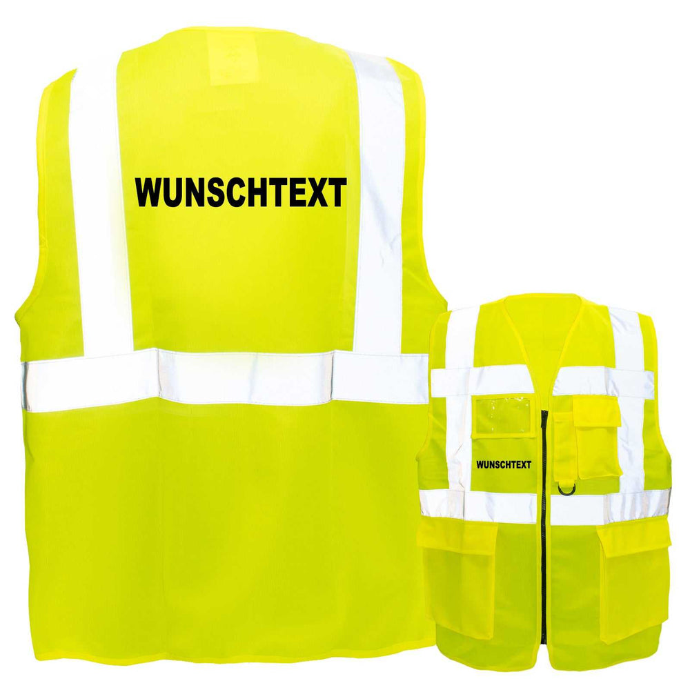 Angeboten werden hochwertige Multifunktions-Warnwesten mit Ihrem Wunschtext als Aufdruck in vielen Farben und Größen mit Reißverschluss, mehreren Taschen, einem Ausweis-Sichtfenster und drei Leuchtstreifen. Im Preis enthalten ist eine einseitige Bedruckung der Westen mit Ihrem Wunschtext, welchen Sie bei Bestellung angeben.