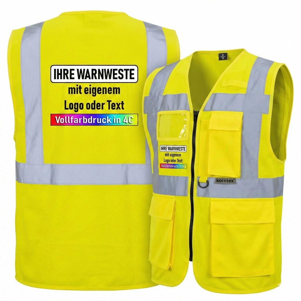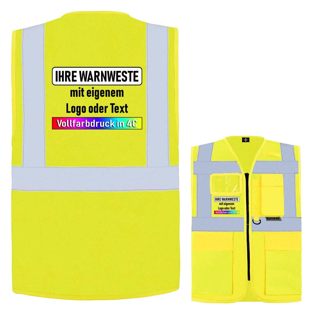 Angeboten werden hochwertige Multfunktions-Mesh-Warnwesten in vielen Farben und Größen mit Reißverschluss, mehreren Taschen, einem Ausweis-Sichtfenster und drei Leuchtstreifen. Wir bedrucken diese auf Wunsch mit Ihrem Wunschtext, Bild, Firmenname oder Logo. Egal ob für den privaten oder geschäftlichen Einsatz, ob mit Ihrem Namen, Firmenlogo, einem Vereinslogo oder einem Text-Hinweis, durch die Bedruckung lassen sich unsere Westen auf vielerlei Weisen einsetzen.